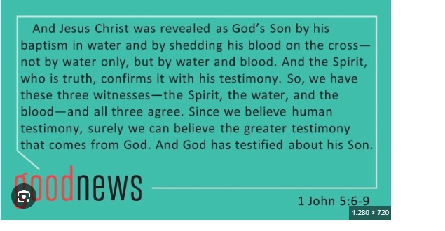 ‘Hij, Jezus Christus is gekomen door het water en het bloed – niet door het water alleen, maar door water en het bloed. En de Geest getuigt ervan, omdat de Geest de waarheid is. Er zijn dus drie getuigen: de Geest, het water en het bloed, en het getuigenis van deze drie is eensluidend. Als we het getuigenis van mensen aannemen, zullen we zeker het getuigenis van God aannemen, dat zoveel meer gezag heeft, want het is het getuigenis dat God over Zijn Zoon gegeven heeft.’ (Uit 1 Johannes 5 uit de verzen 5-12 : 6-9).