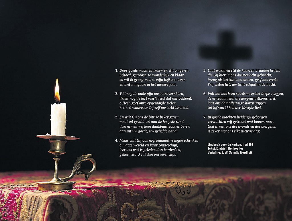Tal van mensen weten zich, 72 jaar na het ontstaan van het gedicht, geïnspireerd door Bonhoeffers woorden. Mét de nazigevangene verwachten ze op de drempel van het nieuwe jaar getroost wat komen mag.